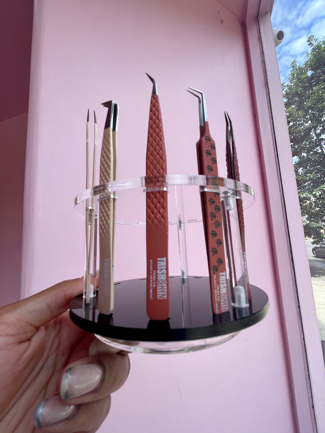 This acrylic stand holds 12 tweezers and spins for your convenience. Keeping all your tools in arms reach.